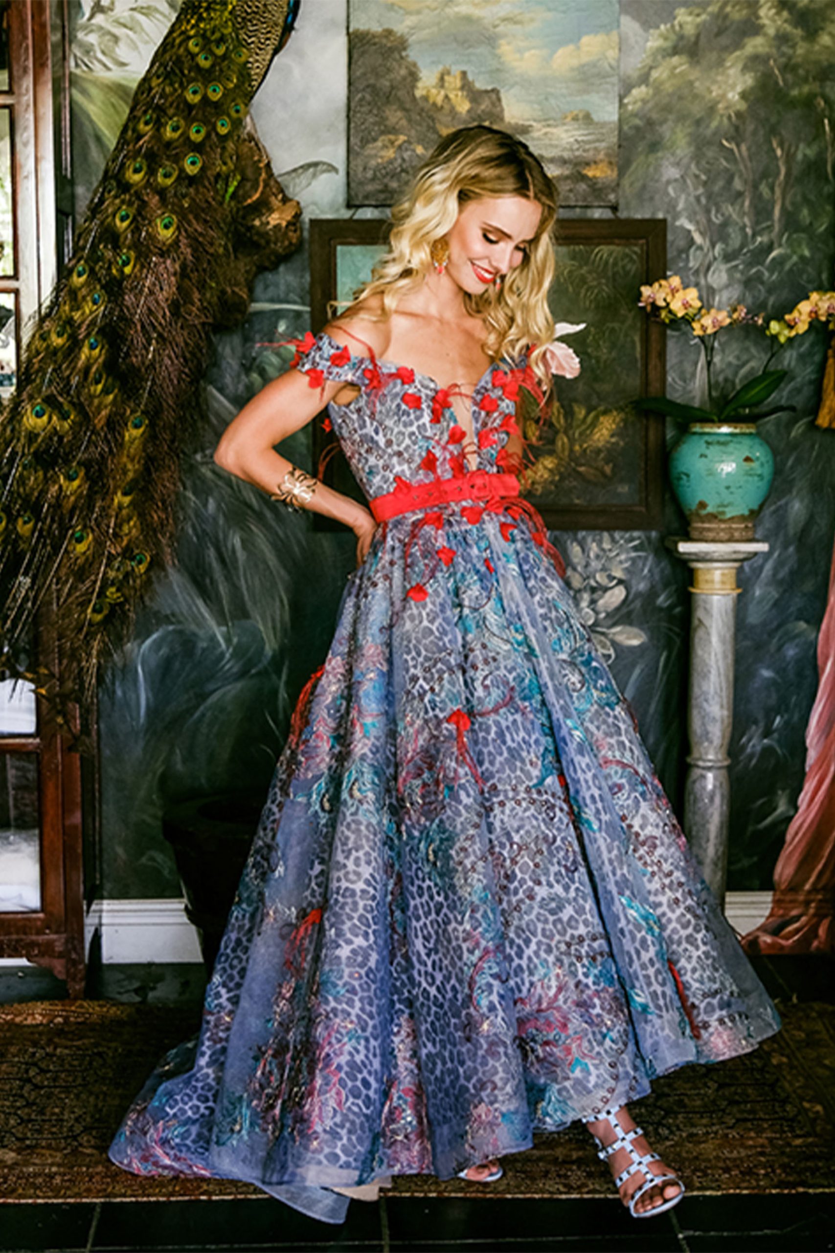 I translated abstract bird and tropical floral illustrations into unique 3-D embroideries on translucent tulle and lined it with either sheer chiffon, spotted tulle, or, to create contrast, with leopard print Georgette.