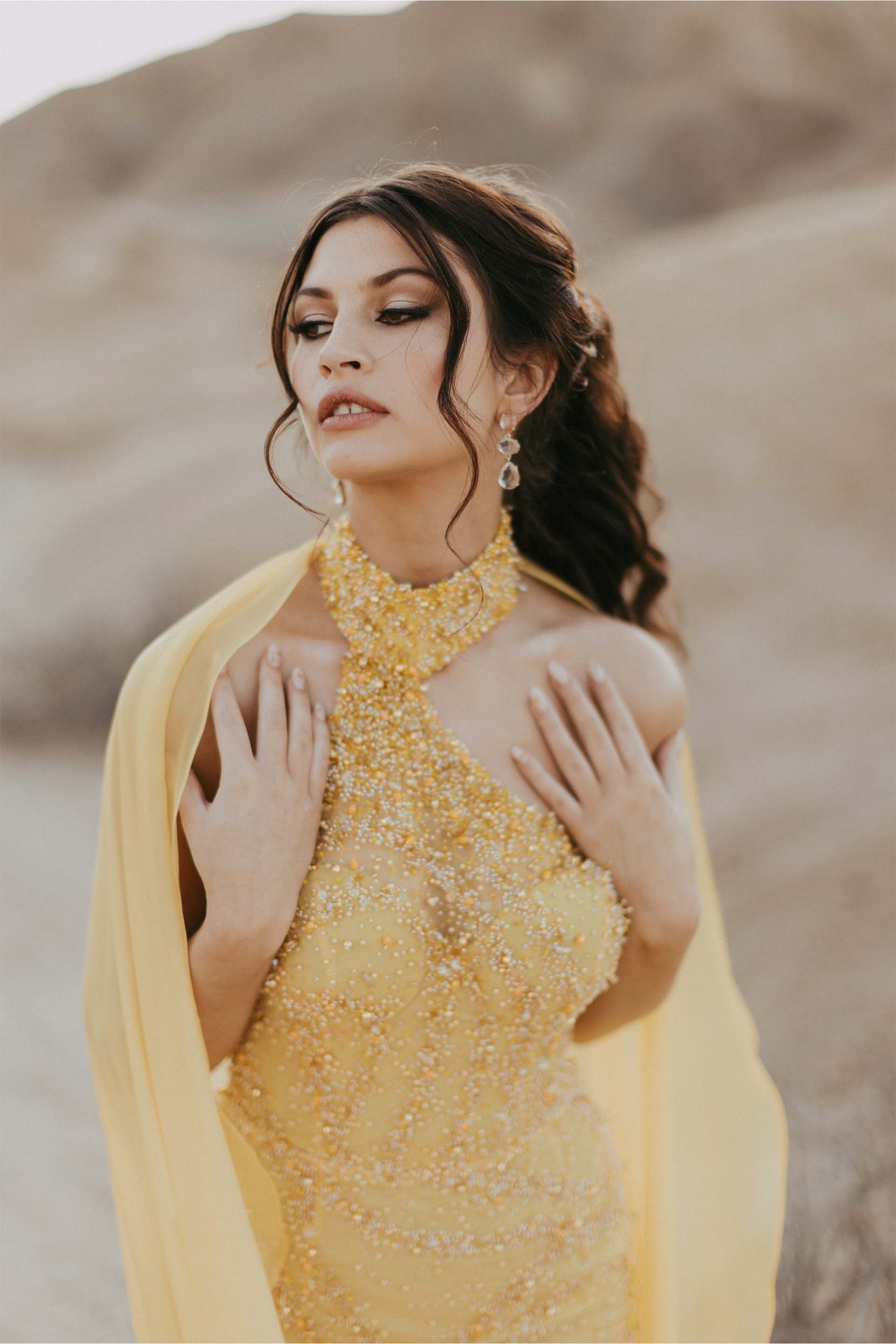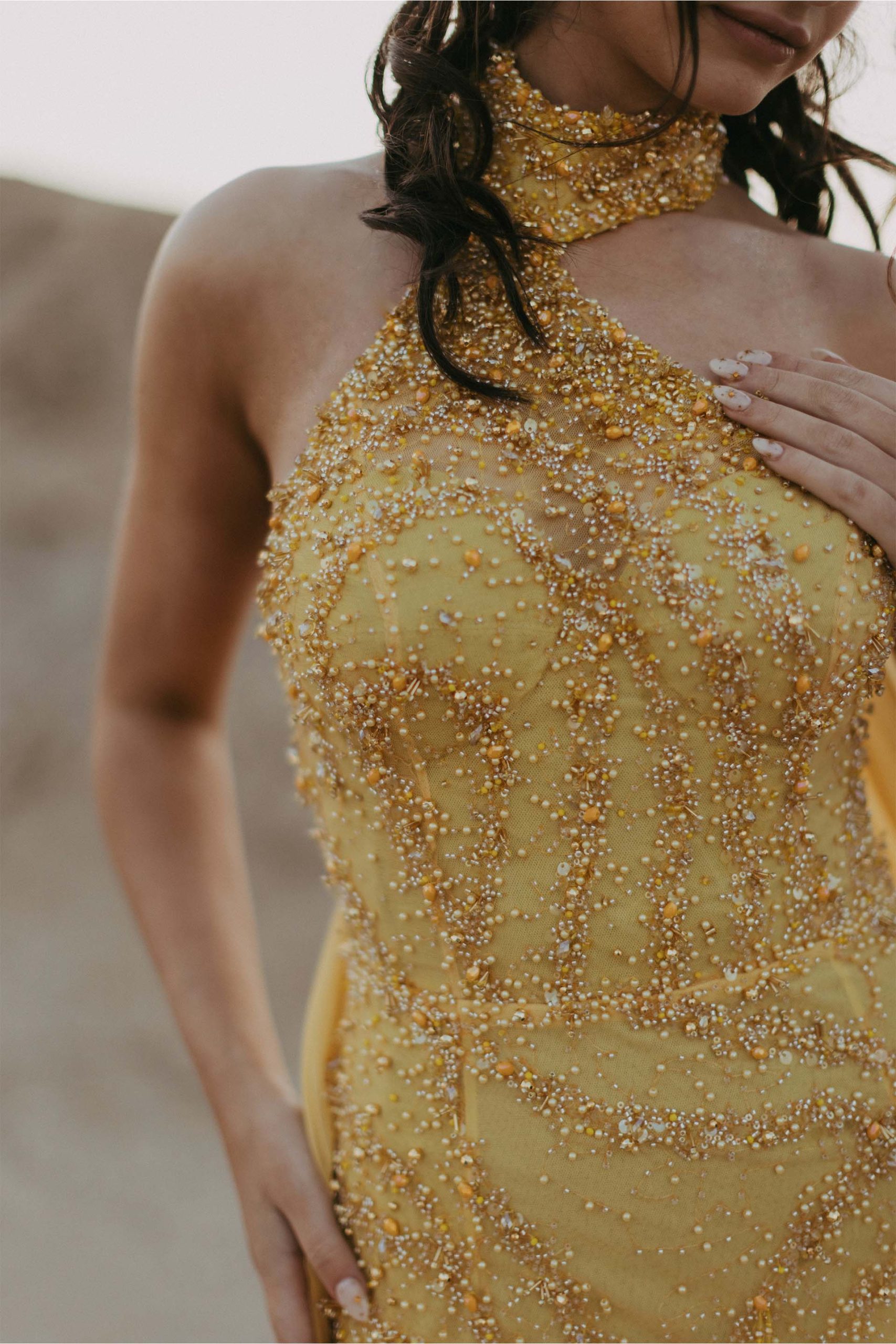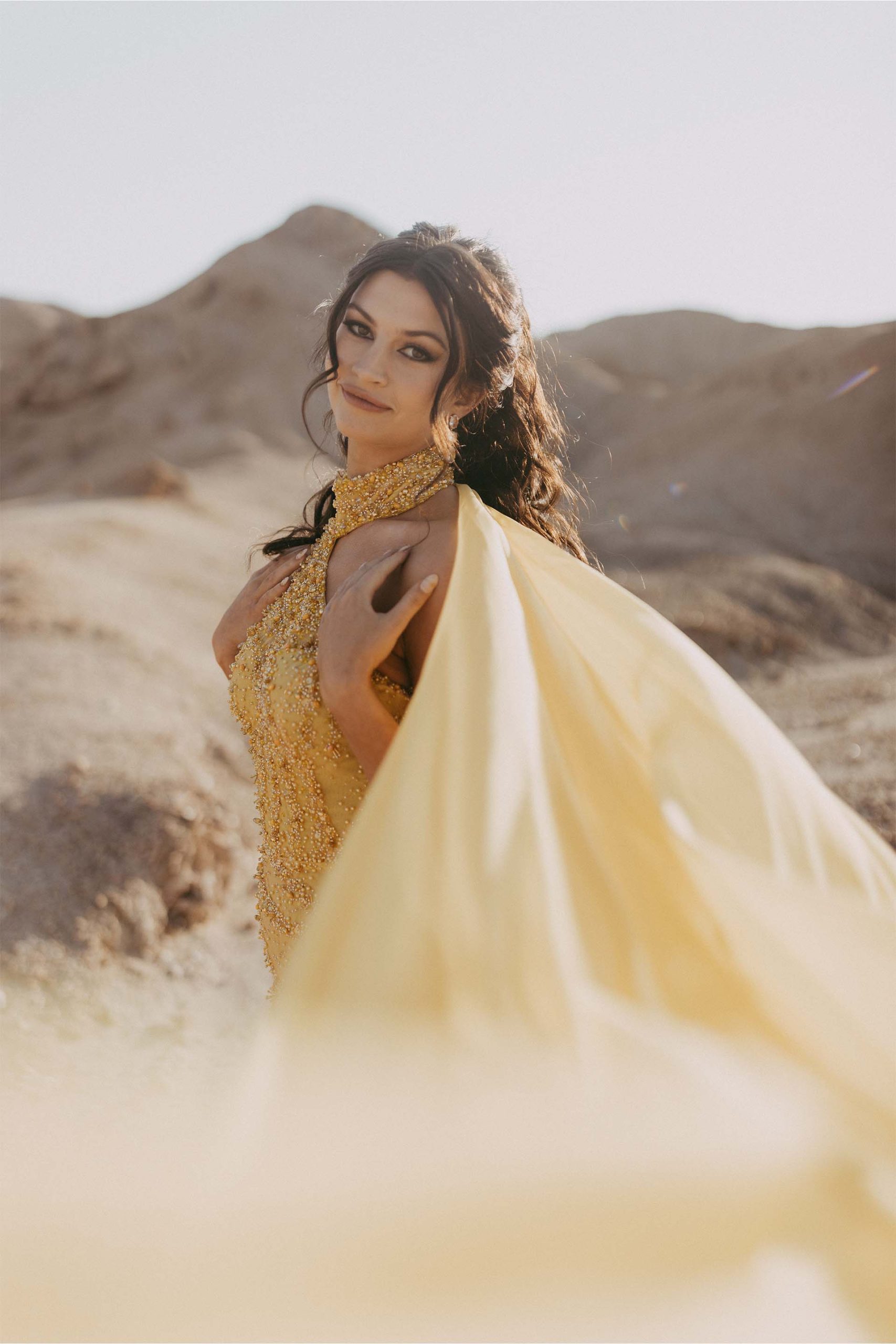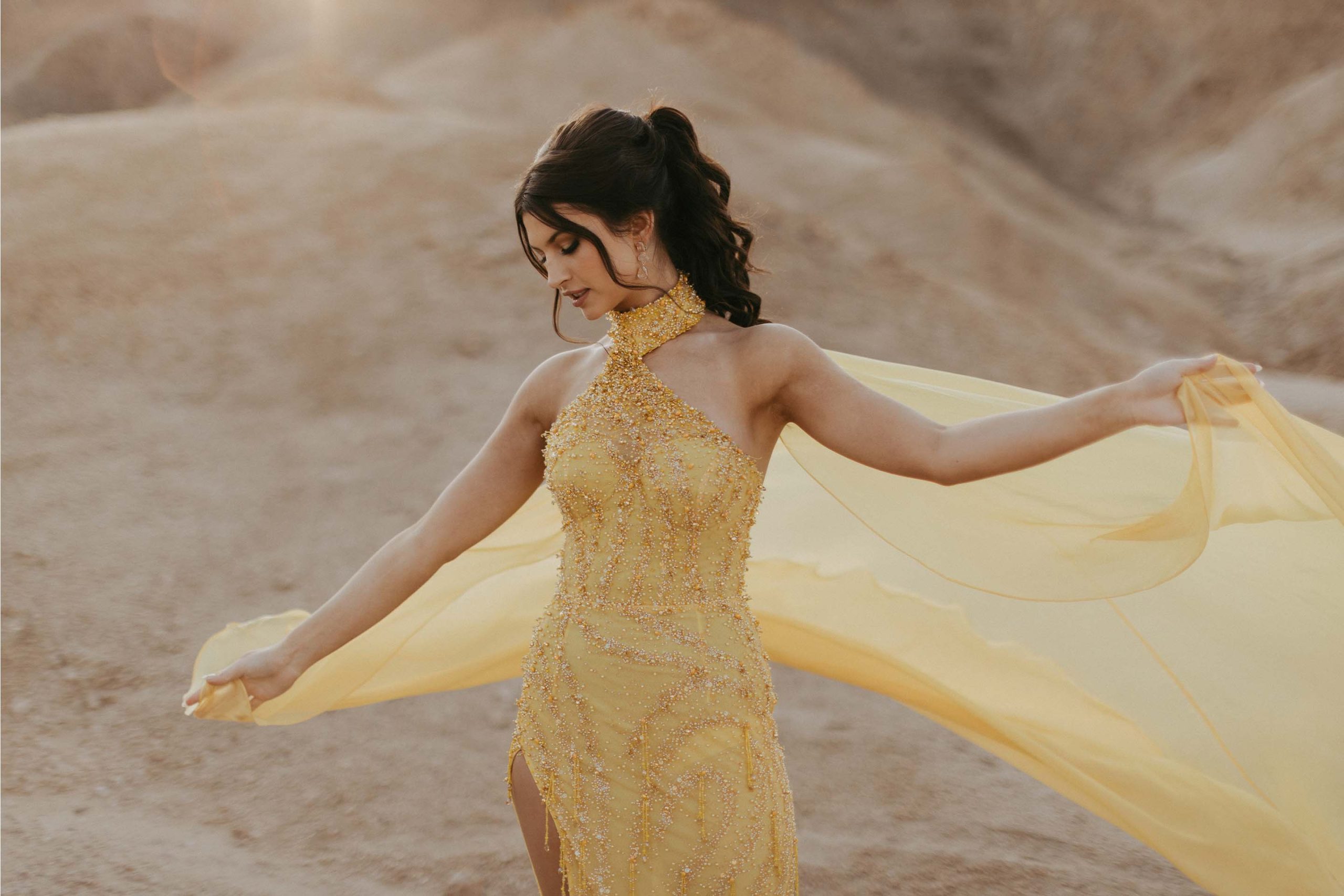 She lit up the evening in a truly unforgettable custom gown—a red carpet showstopper in every sense. Crafted from exquisite beaded embroidered tulle, the fabric was hand-dyed to a vibrant, sun-kissed yellow and adorned with delicate beaded scatters, applied by hand to add rich texture and luminous depth. The final touch? A dramatic detachable cape that added movement, elegance, and just the right amount of flair to this spectacular creation.